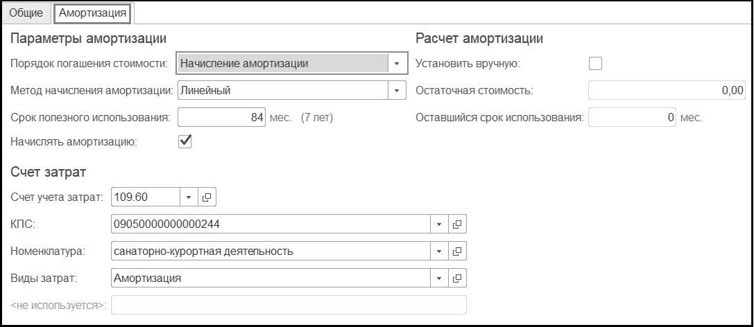 На закладке указываются способ погашения стоимости и параметры амортизации. Закладка доступна в режимах бух. учет и история.