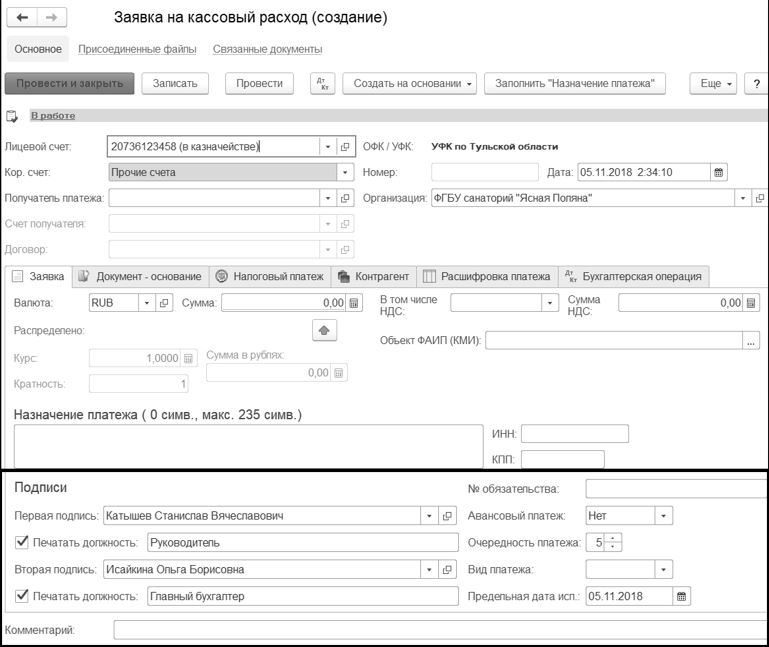В группе реквизитов "Подписи" указываются сведения о лицах, подписывающих заявку на кассовый расход.