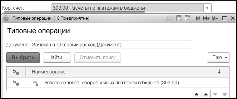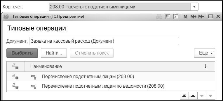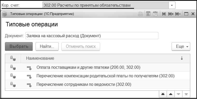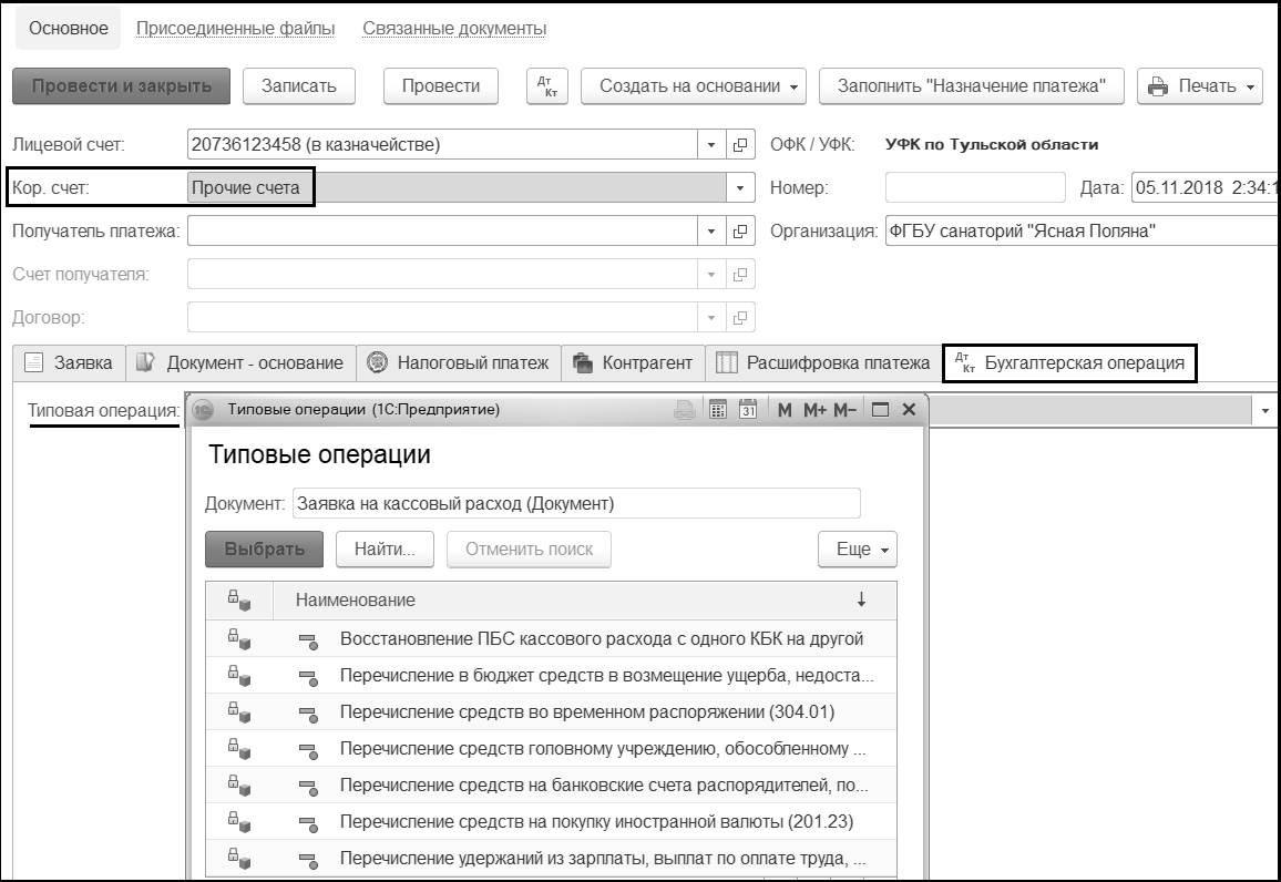 Выбор типовой операции (на закладке "Бухгалтерская операция") осуществляется с учетом выбранного в шапке Кор.счета.