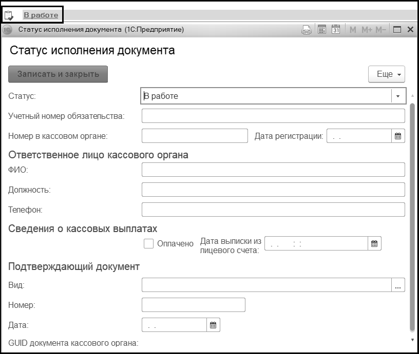 Присвоение и изменение статуса документа выполняется с помощью реквизита Статус формы Статус исполнения документа, открытие которой выполняется с помощью гиперссылки, расположенной в левом верхнем углу ниже кнопки Провести и закрыть. Новому документу автоматически присваивается статус В работе.