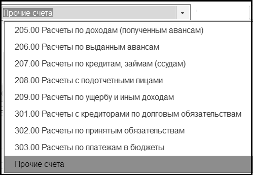 На данной закладке выбирается Типовая операция из списка Типовые операции. Перечень типовых операций зависит от указанного в реквизите Кор. счет значения. Например, для значения реквизита Кор. счет – Прочие счета, состав типовых операций приведен ниже.