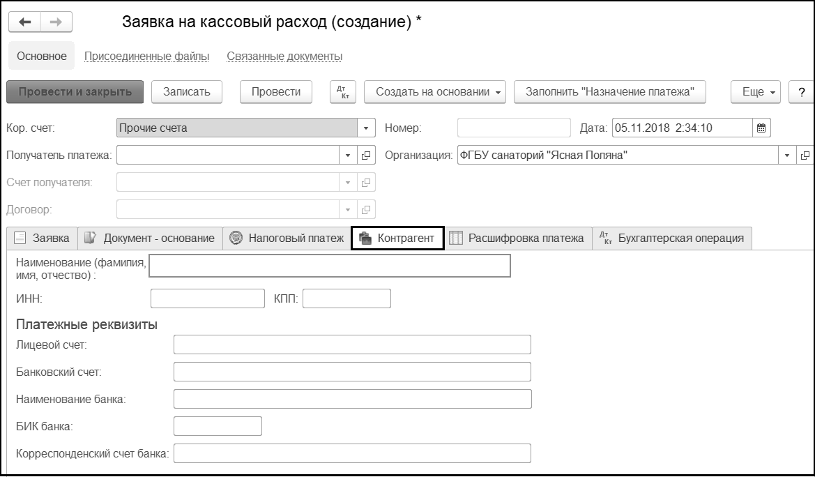 На закладке указываются платежные реквизиты Контрагента – получателя платежа для формирования Раздела 3 "Реквизиты контрагента" печатной формы Заявки на кассовый расход.
