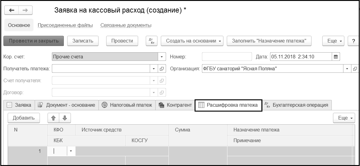 Отметим, что при заполнении табличной части Расшифровка платежа итоговая сумма табличной части должна быть равна сумме документа, указанной на закладке Заявка.