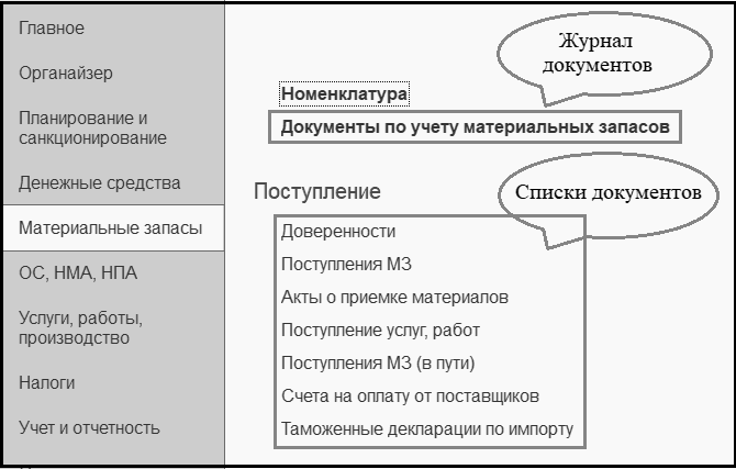 Для просмотра списка введенных в программу документов могут использоваться список документов и журнал документов. В список документов включаются документы одного вида, в журнал документов включаются документы разных видов, в основном относящихся к одному разделу учета. Для просмотра списка документов или журнала документов используются команды меню функций соответствующего раздела.