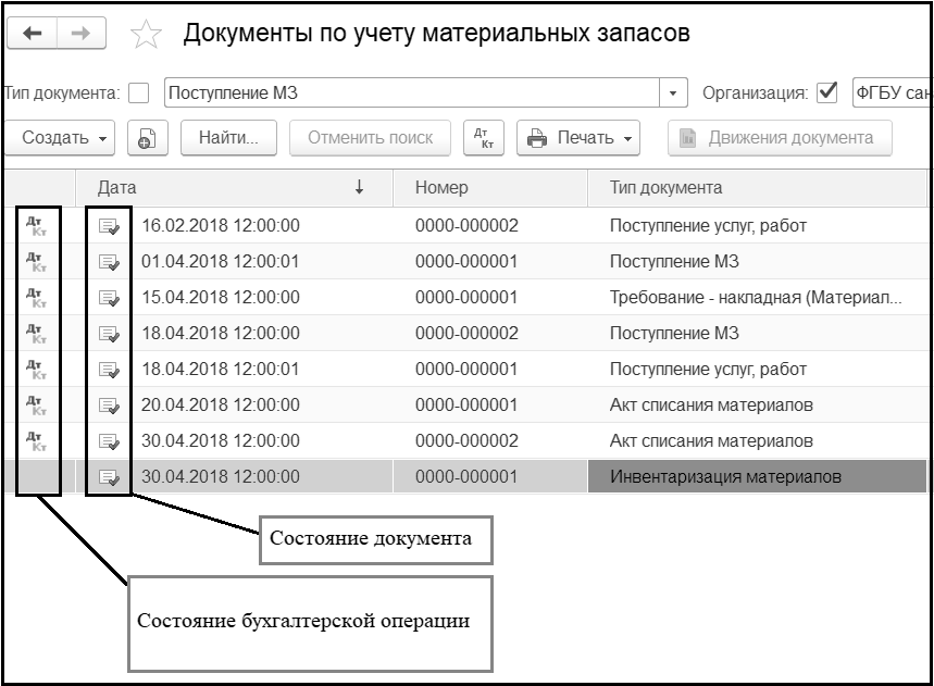 В списках и журналах документов отображается минимальный набор информации, позволяющий идентифицировать документ. Для каждого вида документов этот набор информации может быть различным. Во всех списках и журналах документов выводятся дата документа, номер документа, организация, состояние документа (проведен, не проведен или помечен на удаление) и состояние бухгалтерской операции документа (не указана, указана или проведена). В журналах документов также выводится колонка Тип документа.