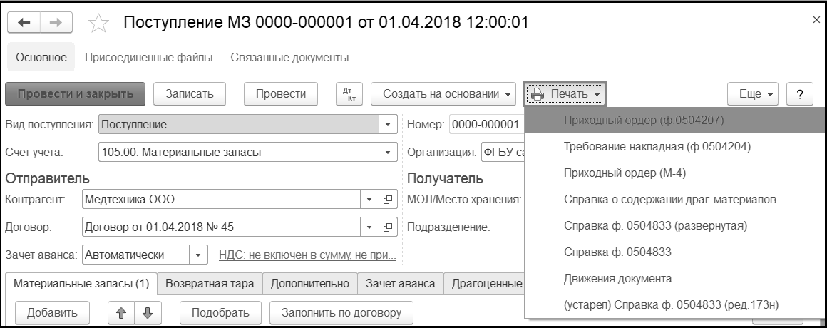 - Печать. Открывает для выбора список печатных форм текущего документа.