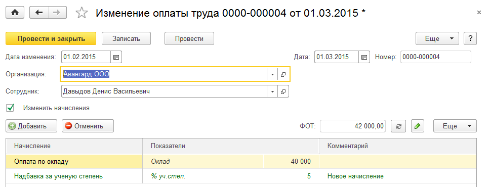 Сотруднику ООО «Авангард» Давыдову Д.В. была назначена надбавка за ученую степень с 01.02.2015. Однако в программу эту информацию не ввели. В марте необходимо доначислить надбавку сотруднику. Для этого введем постоянное начисление документом «Изменение оплаты труда» с 01.02.2015: назначим надбавку за ученую степень 5%.