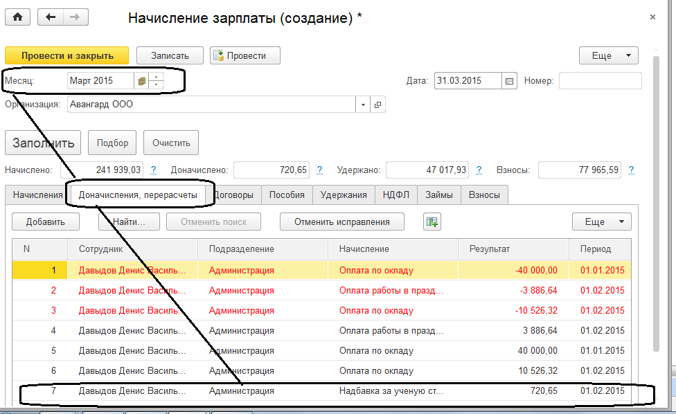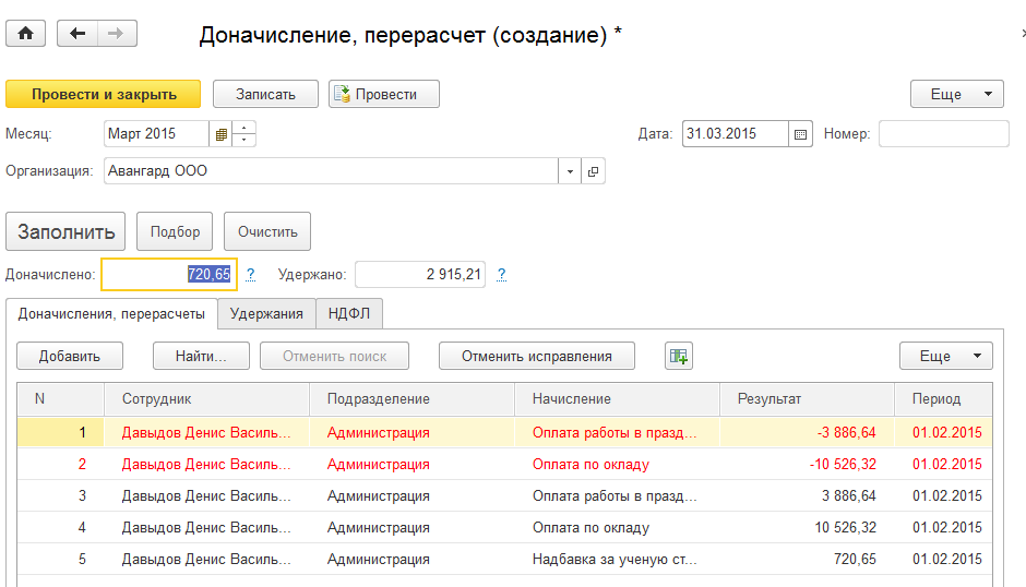 В рамках учебного примера оставим только расчет на закладке «Доначисления, перерасчеты», очистим закладки «Удержания» и «НДФЛ» (на закладке НДФЛ сначала удаляем вычеты, а затем расчет налога). Общий итог досчитается в документе «Начисление зарплаты» (убедимся в этом при закрытии месяца). Проведем документ. В обработке по перерасчетам предложений пересчитать суммы сотрудникам больше не будет.