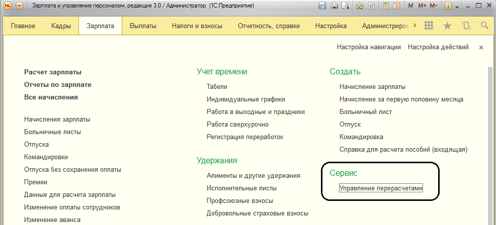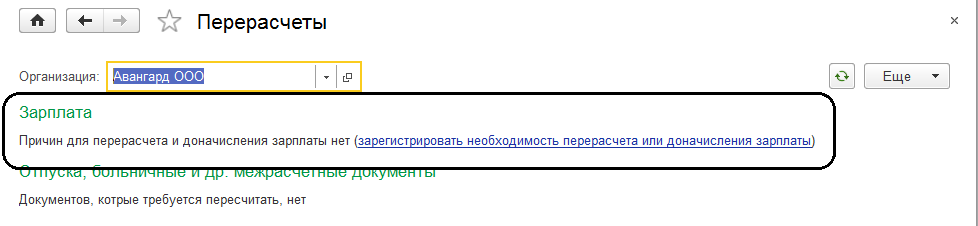 Из раздела «Зарплата/ Управление перерасчетами» вызовем одноименную обработку для анализа необходимости перерасчета.