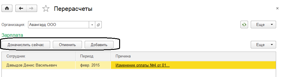 Чтобы провести доначисление, необходимо нажать команду «Доначислить сейчас» - будет создан документ «Доначисления, перерасчеты».