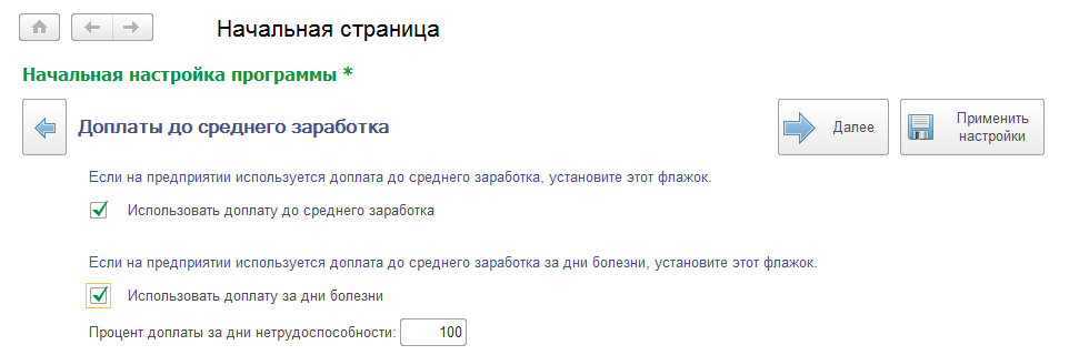 В учебной базе предполагается начисление доплат до среднего заработка, выполним следующие настройки: