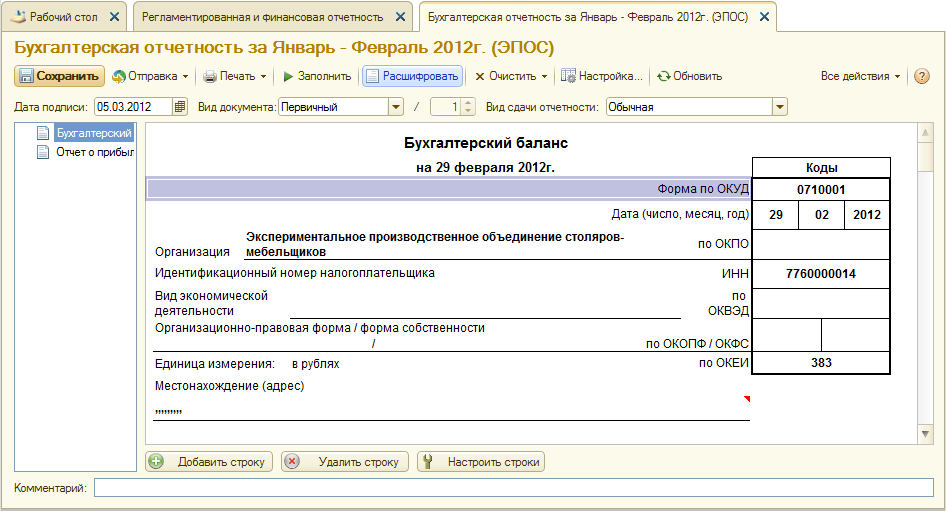 В экранный диалог включены кнопки <Сохранить>, <Отправка>, <Печать>, <Заполнить>, <Расшифровать>, <Очистить>, <Настройка> и <Обновить>, а также поля для настройки некоторых параметров формирования отчета. Например, для бухгалтерского баланса задают дату подписи, вид сдачи отчетности (обычная, промежуточная, ликвидационная) и др.