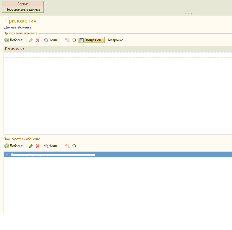 В первом списке (Приложения абонента) регистрируются информационные базы пользователей – преподавателей и студентов. Информационная база представляет собой совокупность Конфигурация +данные. То есть, это аналог списка «Информационные базы» в окне запуска обычной версии «1С:Предприятия». Только информационные базы (также, как и приложения) хранятся не на локальных компьютерах, а в облачном пространстве. Каждую такую базу будем называть индивидуальной областью пользователя.