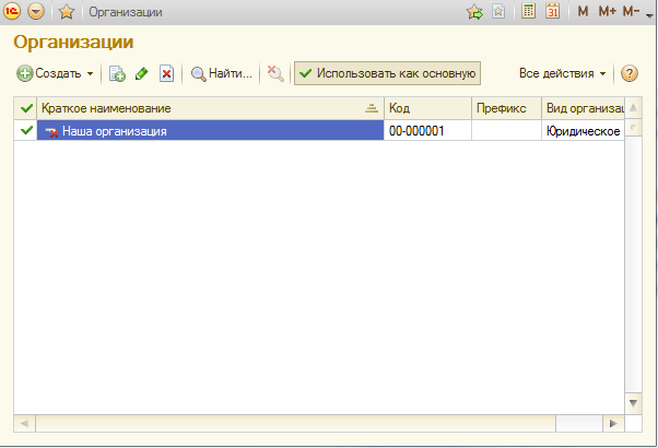 – через Панель разделов → Организации открыть список Организации, в списке имеется одна запись Наша организация (рис. 2-3). Указанная строка была введена автоматически при начальном заполнении информационной базы;