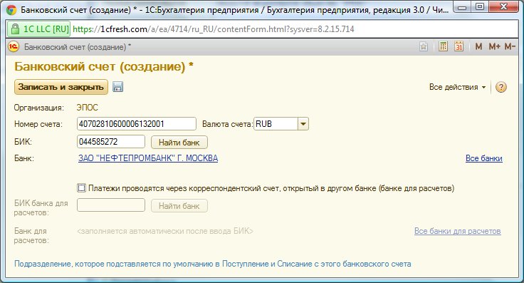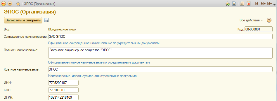 Для того, чтобы сохранить введенные сведения об организации ЗАО ЭПОС необходимо воспользоваться кнопкой <Записать и закрыть>.