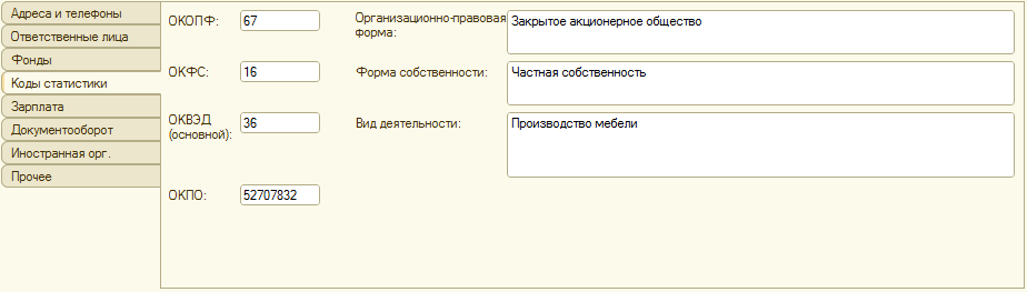 Рис. 2-11. Заполненная закладка Коды статистики в форме сведений о нашей организации