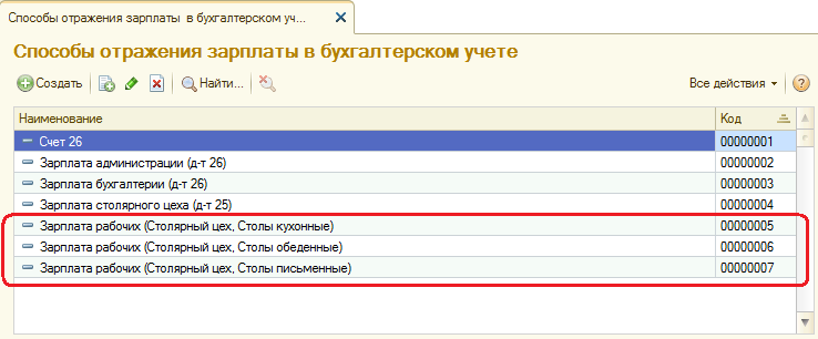 – способ отражения – Зарплата столярного цеха (д-т 25) (элемент справочника Способ отражения зарплаты в бухгалтерском учете);