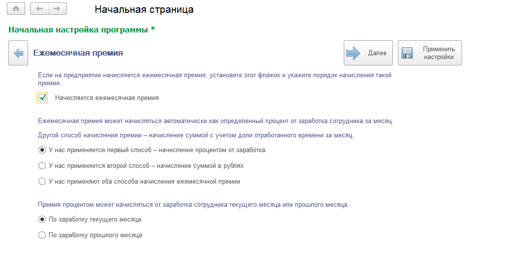 Позволяет автоматически добавить требуемые виды расчета по ежемесячной премии в список начислений информационной базы. Отдельной настройки программы для этого нет, если премию потребовалось добавить впоследствии, пользователь вручную создает подобный вид расчета в списке начислений.