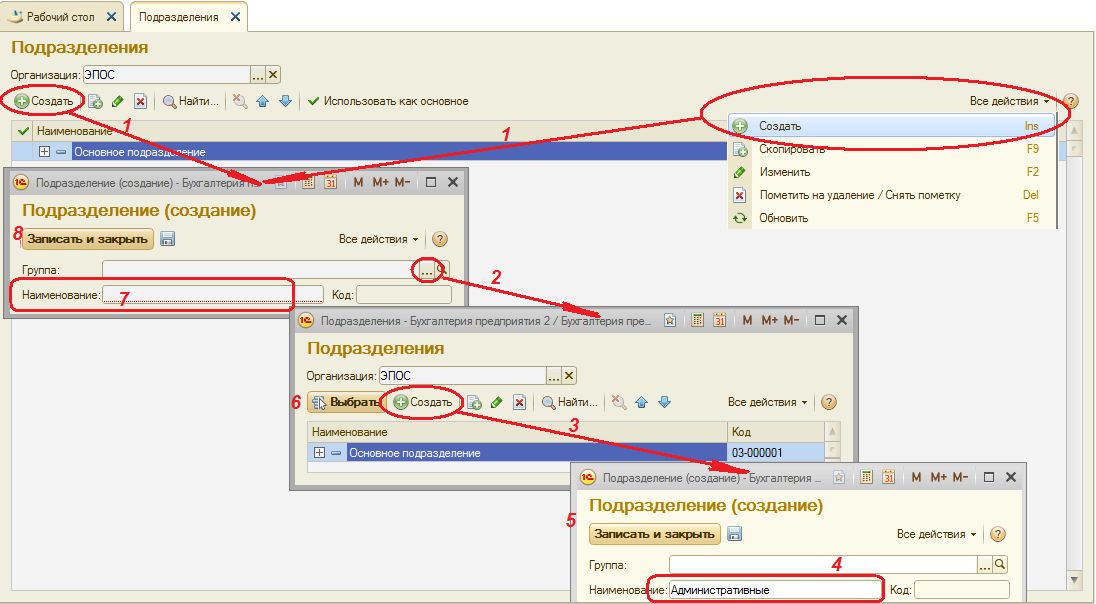 – через меню Все действия → Создать (либо щелчком по пиктограмме на панели инструментов, либо по команде Создать контекстного меню, либо нажатием на клавишу клавиатуры <Insert>) (см. рис. 2-28, шаг 1) открыть форму Подразделение (создание);