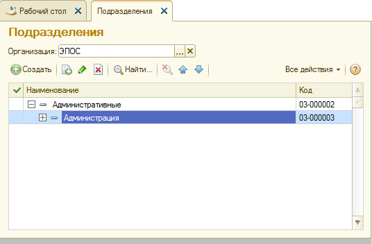 Ввести в справочник «Подразделения организаций» подразделения ЗАО ЭПОС, относящиеся к группе «Административные».