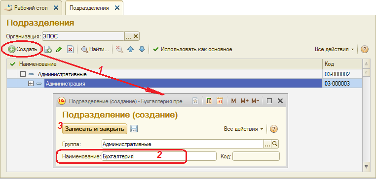 – сохранить элемент Администрация как наименование подразделения, относящееся к группе Административные нажатием кнопки <Записать и закрыть> (см. рис. 2-26, шаг 7).
