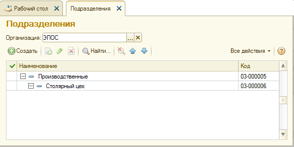 Ввести в справочник «Подразделения организаций» подразделение «Столярный цех», относящееся к группе «Производственные».