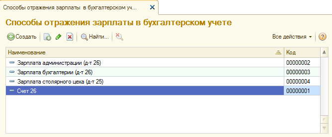 Поскольку предопределенные способы не позволяют учесть расходы на оплату труда всех работников организации, необходимо в этом справочнике описать три новых способа (два - для отражения расходов по дебету счета 26 для подразделений Администрация и Бухгалтерия и еще один - для отражения расходов по дебету счета 25 для подразделения Столярный цех.