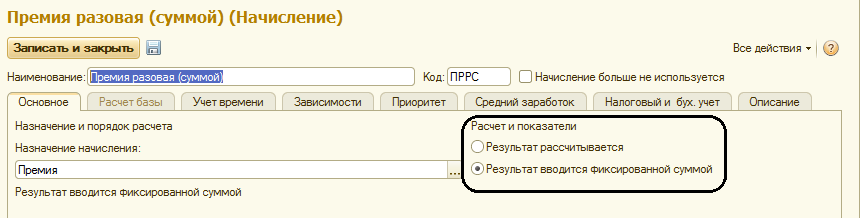 Г) Начисление будет выполняться по отдельному документу (обратите внимание на предупреждение программы – говорится о том, что в программе уже есть разовая премия по отдельному документу, однако она иной формулы, поэтому сообщение в этом примере игнорируем), остальные настройки оставим пока по умолчанию, запишем и закроем настройки данного начисления.