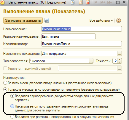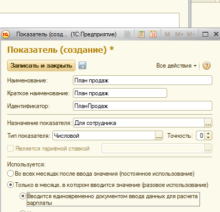 · Доплата сотруднику зависит от выполнения плана. Показатель "Выполнение плана" настраивается как разовый, поскольку неясно, каждый ли месяц сотрудник будет успешно выполнять план или нет, его можно ввести двумя способами: