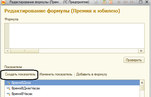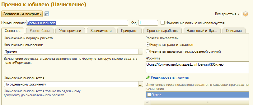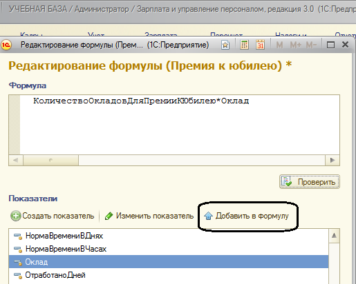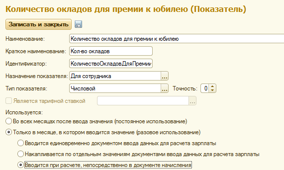 Б) для того, чтобы рассчитать данное начисление, нам потребуется написать следующую формулу: оклад*количество окладов. При этом показатель "Оклад" уже есть в типовой поставке, знак умножения достаточно набрать с клавиатуры, и следует ввести дополнительный показатель "Количество окладов для премии к юбилею", добавим его в список показателей и укажем следующие настройки: