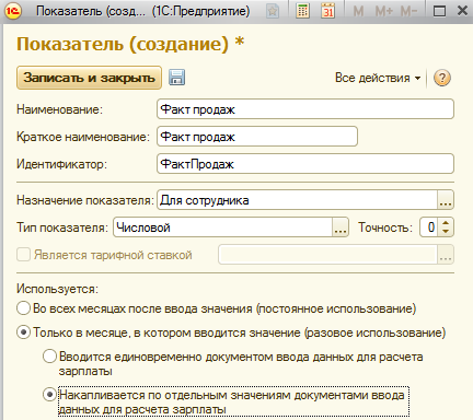 2. Многократно (накапливая) в течение месяца, когда по сотруднику ежедневно в течение месяца появляется информация о количестве продаж/ производства и т.п. - в этом случае устанавливается переключатель "Накапливается по отдельным значениям документами ввода данных для расчета зарплаты".