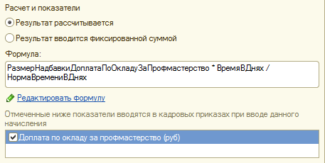 В этой формуле: показателями являются "РазмерНадбавки ДоплатаПоОкладуЗаПрофмастерство", "ВремяВДнях", "НормаВремениВДнях"; а также используются функции умножения и деления. Показатели времени являются предопределенными ("ВремяВДнях", "НормаВремениВДнях"), а показатель "РазмерНадбавкиДоплатаПоОкладуЗаПрофмастерство" был добавлен стартовым помощником.