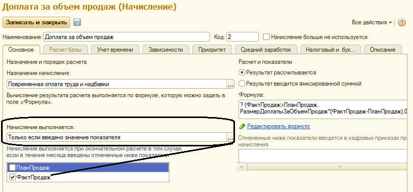 Г) Начисление будет выполняться только в том случае, если в этом месяце у сотрудника будет факт продаж, остальные настройки оставим пока по умолчанию, запишем и закроем настройки данного начисления.