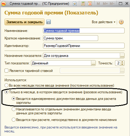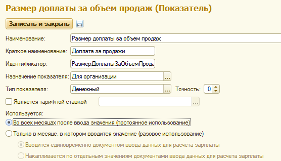 Во всех месяцах после ввода значения (постоянное использование). Обычно используется для плановых начислений, которые выполняются ежемесячно либо в перечисленных месяцах. Для указания размера показателя для сотрудников используются кадровые документы (реже разовые), для организаций и подразделений значения вводятся документом "Данные для расчета заработной платы".