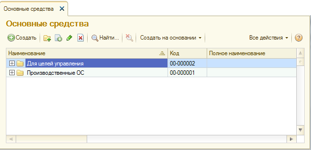 Ввести в справочник «Основные средства» два элемента-группы «Производственные ОС» и «Для целей управления».