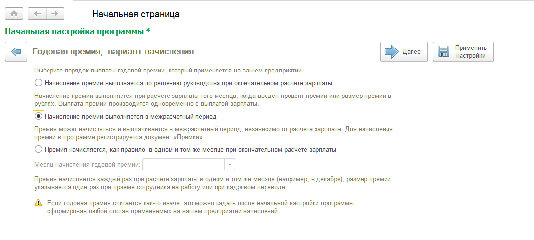 Позволяет автоматически добавить требуемые виды расчета по годовой премии в план видов расчета "Начисления". Отдельной настройки программы для этого нет, если премию потребовалось добавить впоследствии, пользователь вручную создает подобный вид расчета в списке начислений.