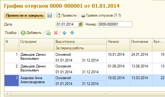 Составим график отпусков на 2014 год для нескольких сотрудников.