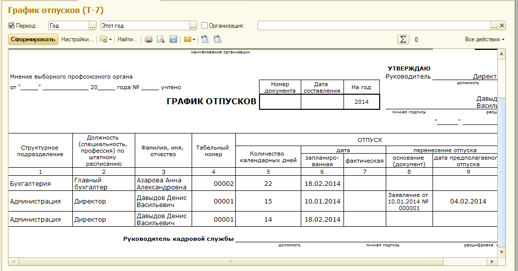 Также отчет по графику отпусков по форме Т-7 доступен в разделе "Кадры - Кадровые отчеты".