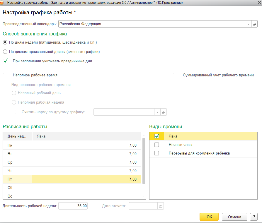 1. Сокращенное рабочее время = 35 ч. в неделю (в нашем учебном примере этот график может использоваться для инвалидов)