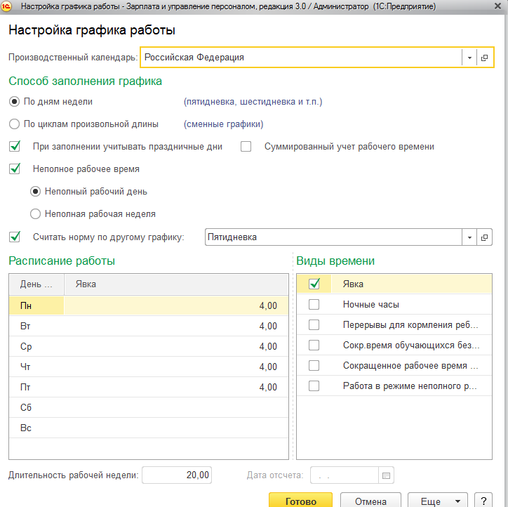 2. График неполного рабочего времени – 20 часов в неделю. В учебной базе мы будем использовать этот график для совместителей, работающих на 0,5 ставки. Норма определяется по пятидневному графику: