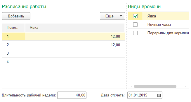 По умолчанию предполагается, что в графике работы будет запланировано явочное время. Однако если в конфигурации в соответствии с настройками расчета зарплаты ведется учет ночных, вечерних часов, используются перерывы для кормления детей или несколько видов планового времени, то возможно отметить флажками несколько видов рабочего времени для графика.