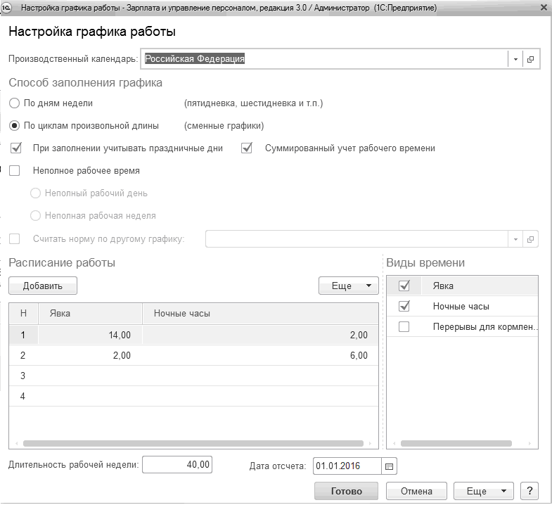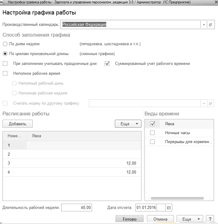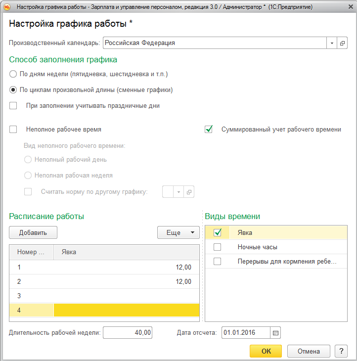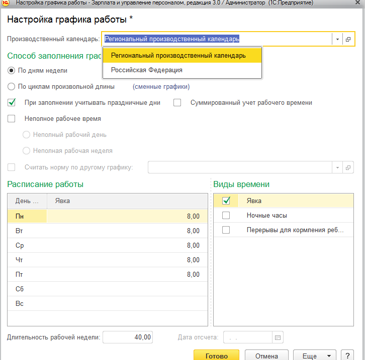 Длительность рабочей недели – это норма по производственному календарю, на который следует ориентироваться, составляя графики суммированного учета. По умолчанию количество часов равно 40, и может быть изменено вручную.