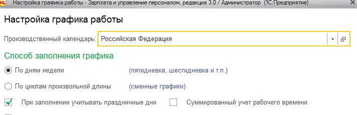 - Также в таких графиках часто используется режим суммированного учета. Если организация действует непрерывно, и работа осуществляется и в праздничные, флажок "При заполнении учитывать праздничные дни" снимается.