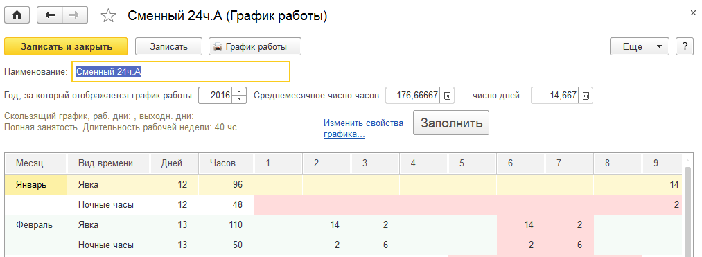 1. Создадим сменный график "Сменный 2/2_А", настроим вручную и заполним их на 2016 год. Ведется суммированный учет рабочего времени, организована работа в праздники.