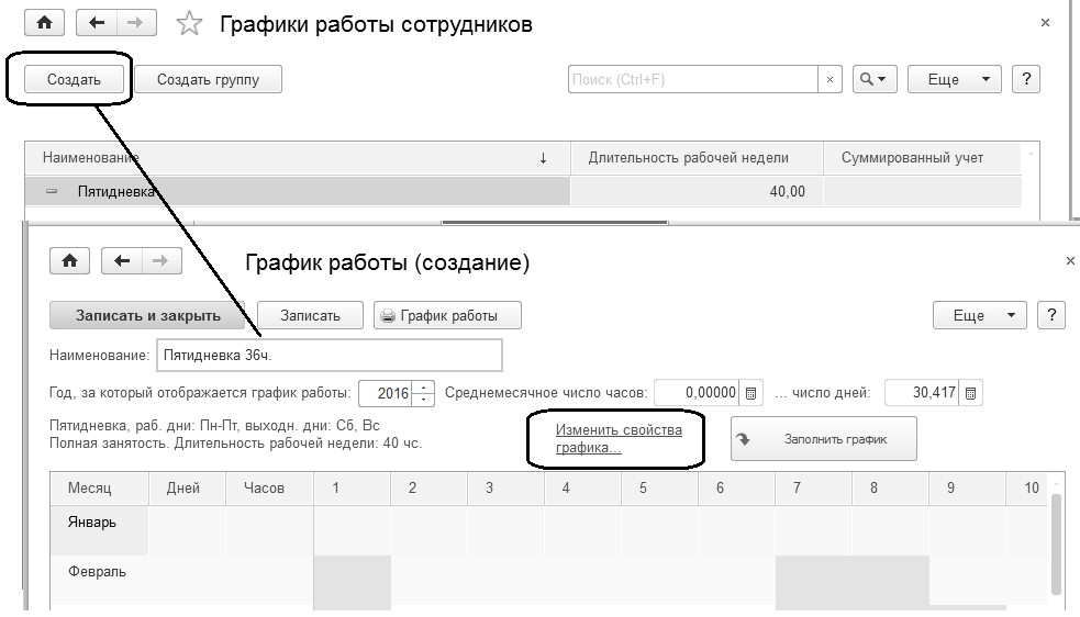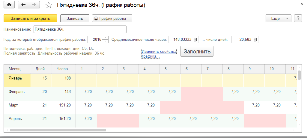 1. Настроим график "Пятидневка 36ч.": укажем заполнение на 2016г. и перейдем к настройке свойств графика:
