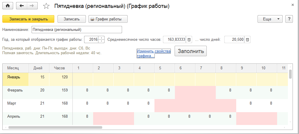 Внешний вид графика представляет собой таблицу, в которой помесячно отмечены объемы рабочего времени по конкретным дням либо сменам на выбранный год, нерабочие (выходные и праздничные) дни и общее количество рабочих дней и часов в месяцах. Стандартный пятидневный график работы при 40-часовой неделе, как правило, заполняется автоматически при работе помощника начальной настройки программы.