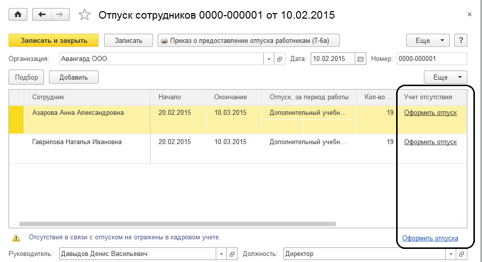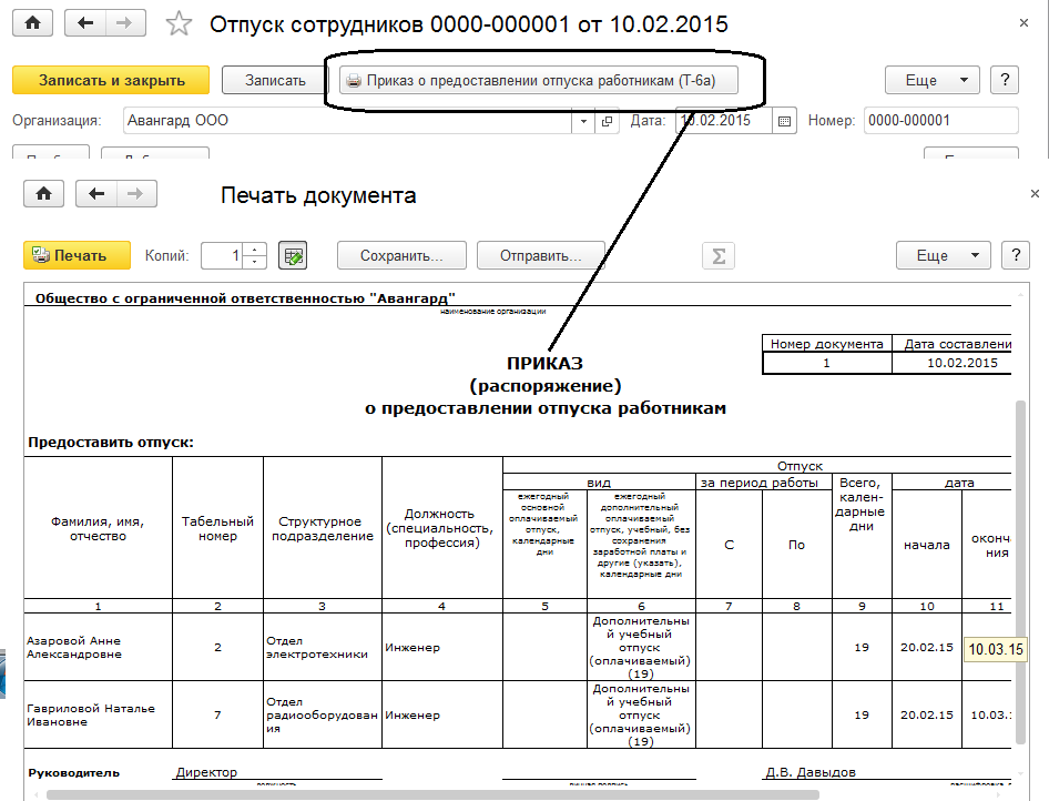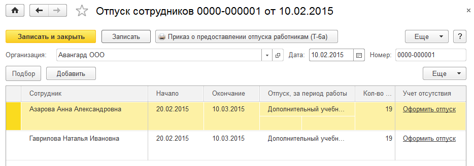 Также из формы документа выводится на печать приказ на отпуск по форме Т-6а. Обратите внимание на то, что документ не имеет режима проведения, а только записывается.