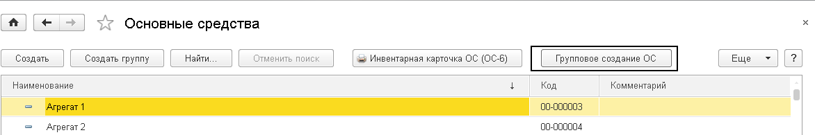Часто в организацию поступают одноименные основные средства. По правилам бухучета каждому основному средству надо присвоить свой инвентарный номер. В конфигурации «Бухгалтерия предприятия» существует обработка. Которая позволяет выполнить эту задачу. Для этого в справочнике «Основные средства» есть кнопка «Групповое создание ОС».