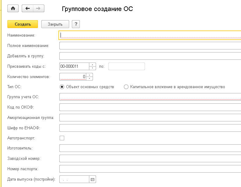 В форме группового создания указывается инвентарный номер с которого нужно начать, количество элементов, основные и постоянные сведения. После этого по кнопке «Создать» в справочник «Основные средства» будут добавлены новые элементы.