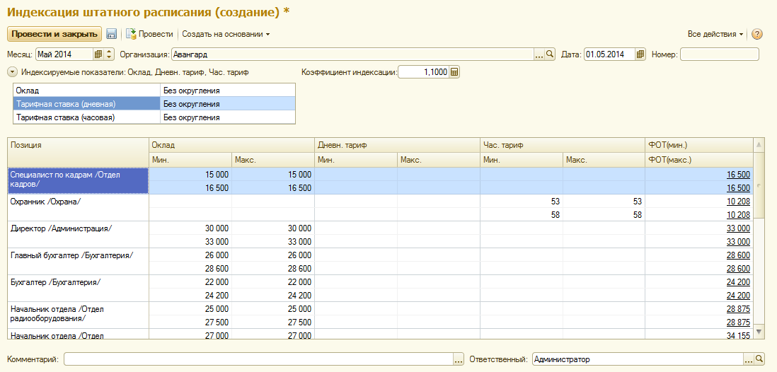 Документ "Индексация штатного расписания" доступен в разделе "Кадры / Индексация штатного расписания" (блок по штатному расписанию). В документе указывается месяц индексации, коэффициент индексации, а также организация, для которой индексируется штатное расписание. Индексируемые показатели (составляющие совокупную тарифную ставку) могут индексироваться без округления либо с округлением.